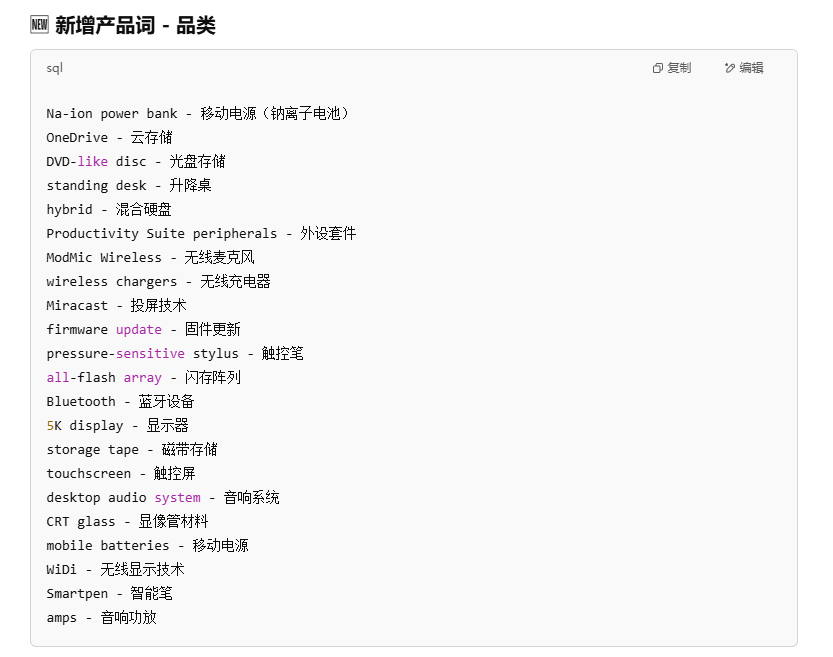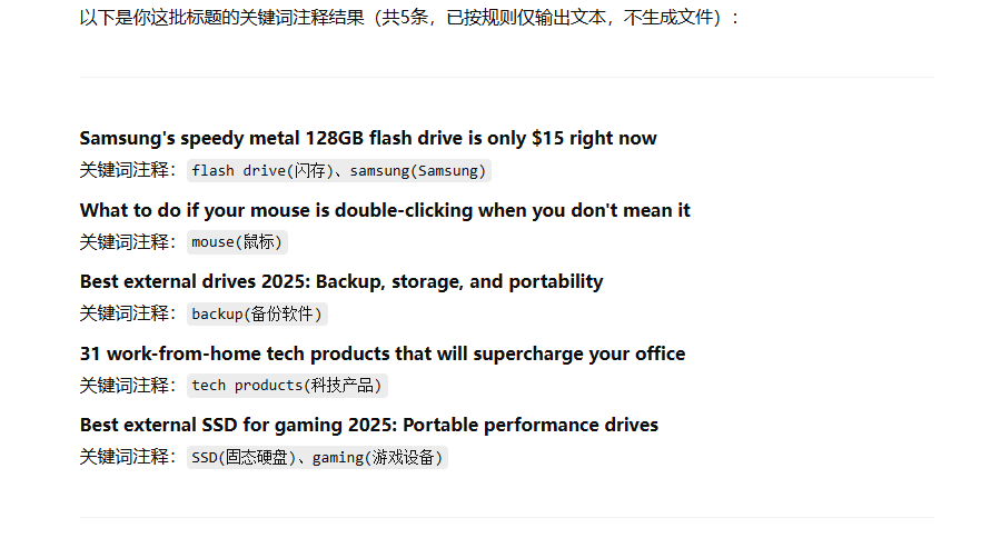 3. 输出格式为:英文(中文),多个关键词以顿号“、”分隔,例如:flash drive(闪存)、Samsung(三星)