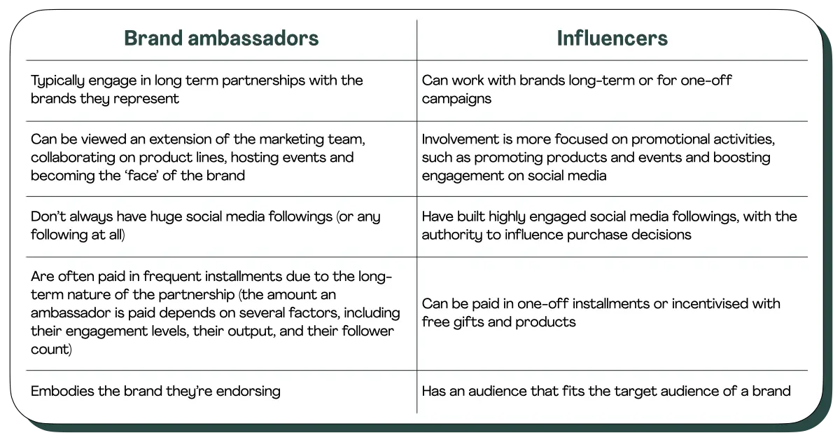 品牌大使和影响者有一些相似之处——他们都倡导品牌并与他们的网络分享产品和服务,但也存在一些关键差异。